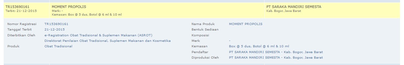 Moment Propolis Brazilian adalah salah satu produk dari PT Momen Global Internasional yang digunakan untuk kesehatan. Propolis menurut bahasa Yunani secara harfiah terbagi dari 2 kata yakni Pro artinya PERTAHANAN dan Polis artinya KOTA, sehingga propolis memiliki arti secara bebas Sistem Pertahanan Kota. Lebah menghasilkan propolis yang terdiri dari campuran kompleks balsam, malam, resin dan polen yang didapat dari pucuk daun, getah atau produk botanical yang ada. Pada awalnya propolis digunakan lebah untuk menambal dan mensterilkan sarang dari serangan serangga, bakteri, jamur dan parasit lainnya, sehingga propolis memiliki sifat disinfektan.